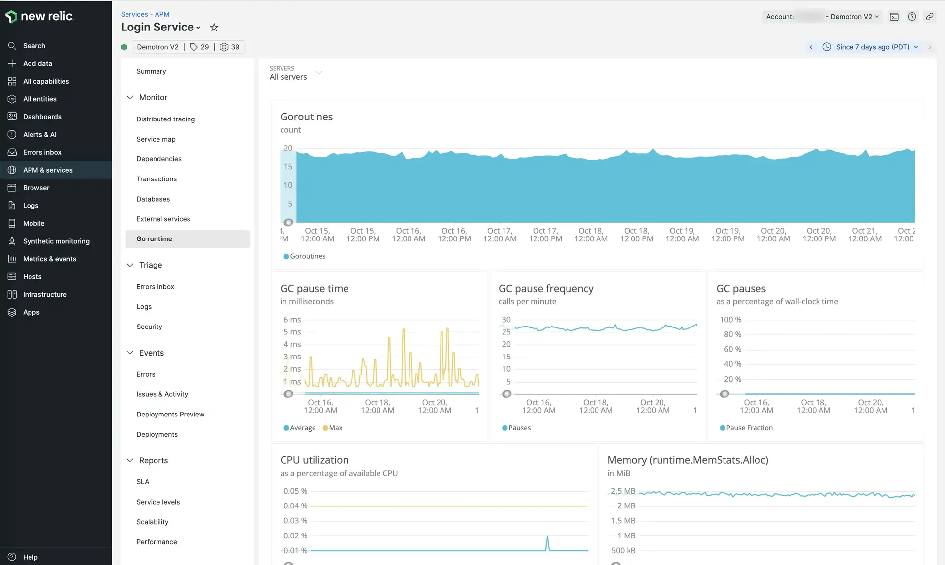 The APM user interface provides a variety of data about your app, including special features for the Go agent for APM. In addition, the Go runtime page provides important runtime data useful for troubleshooting performance issues.