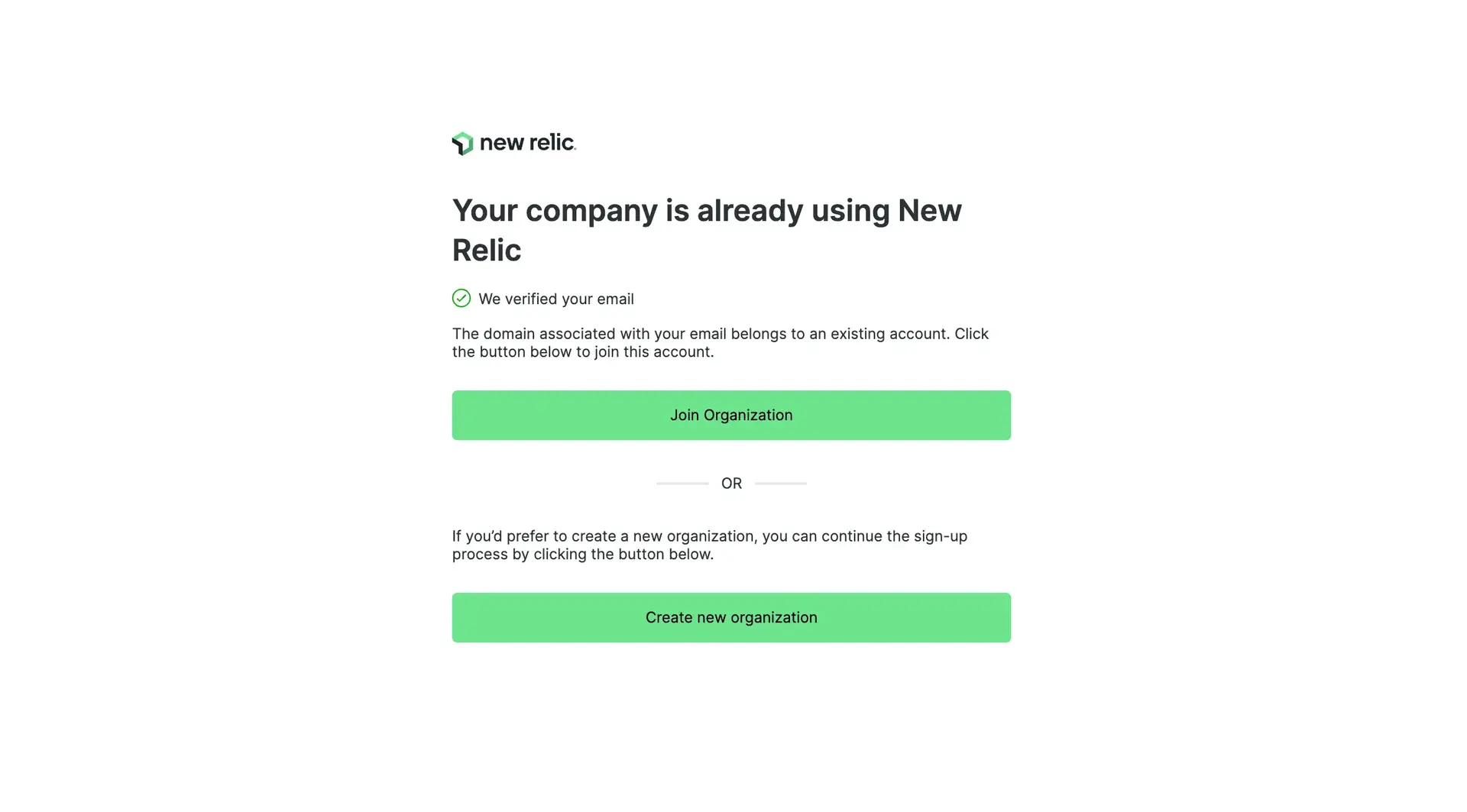 : La captura de dominio está deshabilitada pero su usuario ve una nota que indica que ya existe una organización New Relic para ese dominio de correo electrónico.