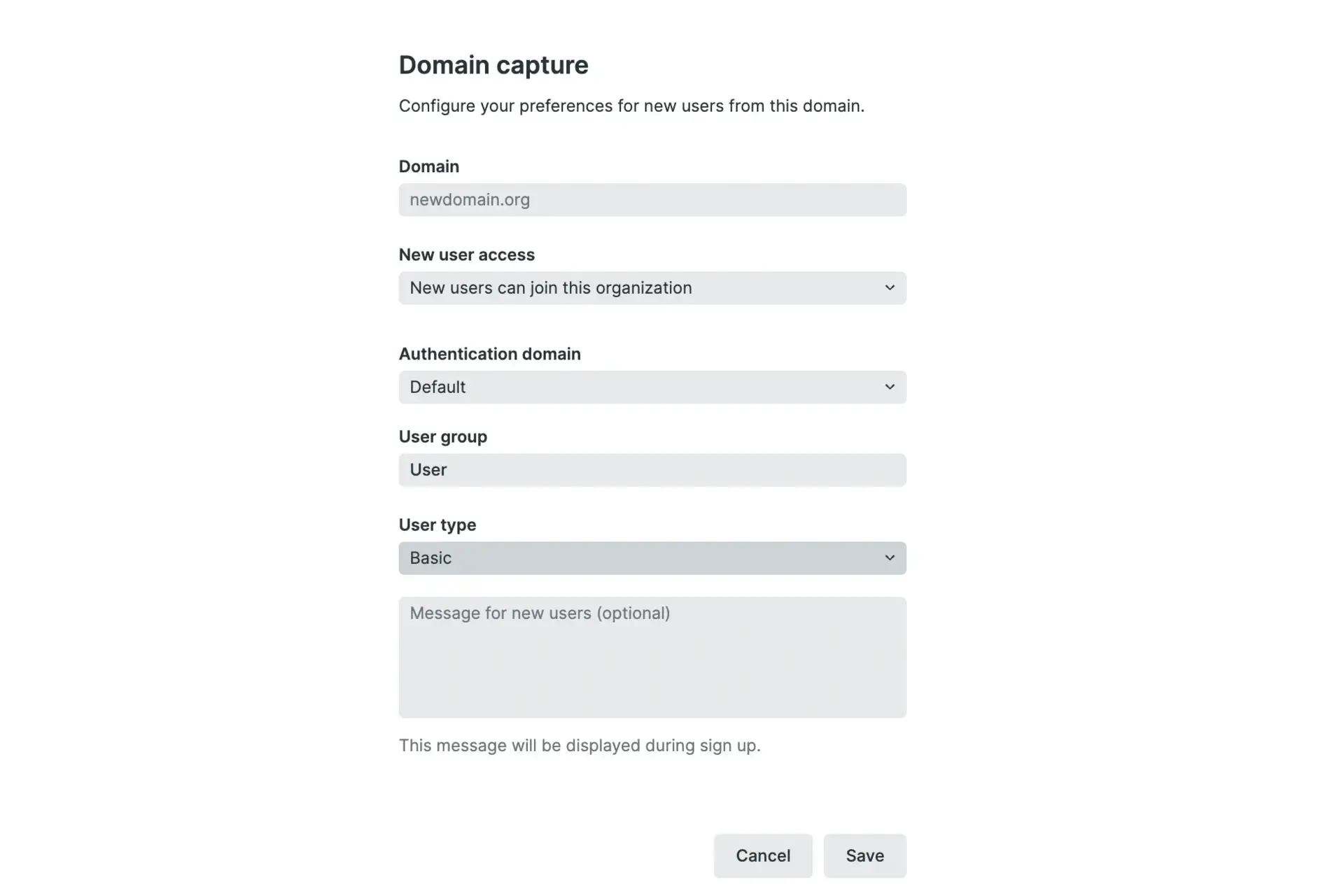 Cuando se configura por primera vez una captura de dominio y aún está en estado Pending , se deshabilita, lo que corresponde a que New user access se establezca en None. Las opciones para New user access incluyen: