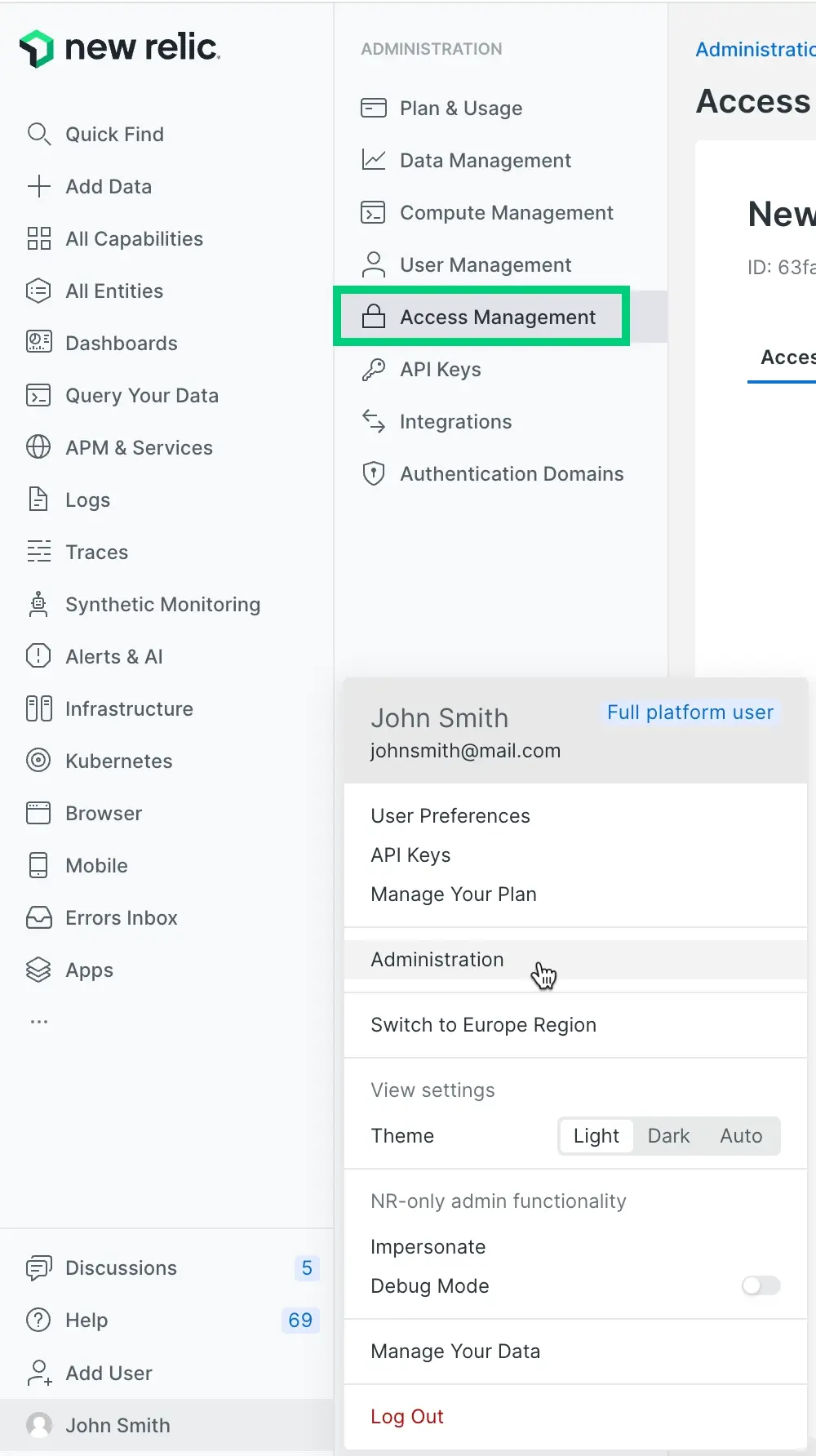 Haga clic en su nombre de usuario y luego en Administration > Access Management.