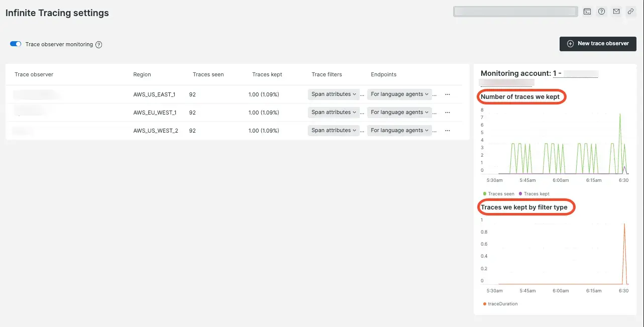 Infinite Tracing (anteriormente llamado "New Relic Edge") ofrece monitoreo del observador de trazas para que pueda obtener información adicional valiosa sobre el comportamiento de muestreo del observador de trazas. Esta característica opcional le muestra la cantidad de traza vista y conservada por el observador de traza. Las trazas métricas del observador se escriben en la cuenta que elija y están disponibles para ver en la configuración de Infinite Tracing o en nuestro generador de consultas.