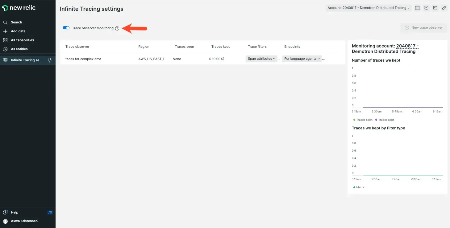 Si decides en algún momento que quieres cambiar qué cuenta recibe la traza métrica del observador, puedes hacerlo en la configuración de Infinite Tracing.