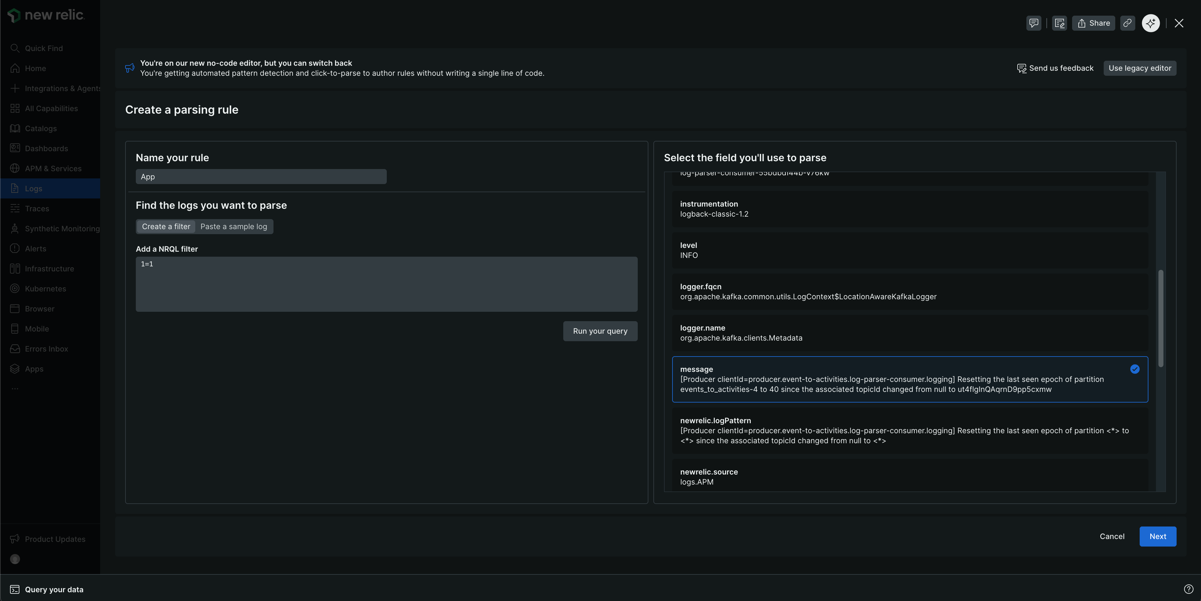 Si vous collez un exemple de log, vous devez définir la clause NRQL WHERE pour correspondre à vos logs, sélectionner le champ que vous souhaitez analyser et cliquer sur Next.