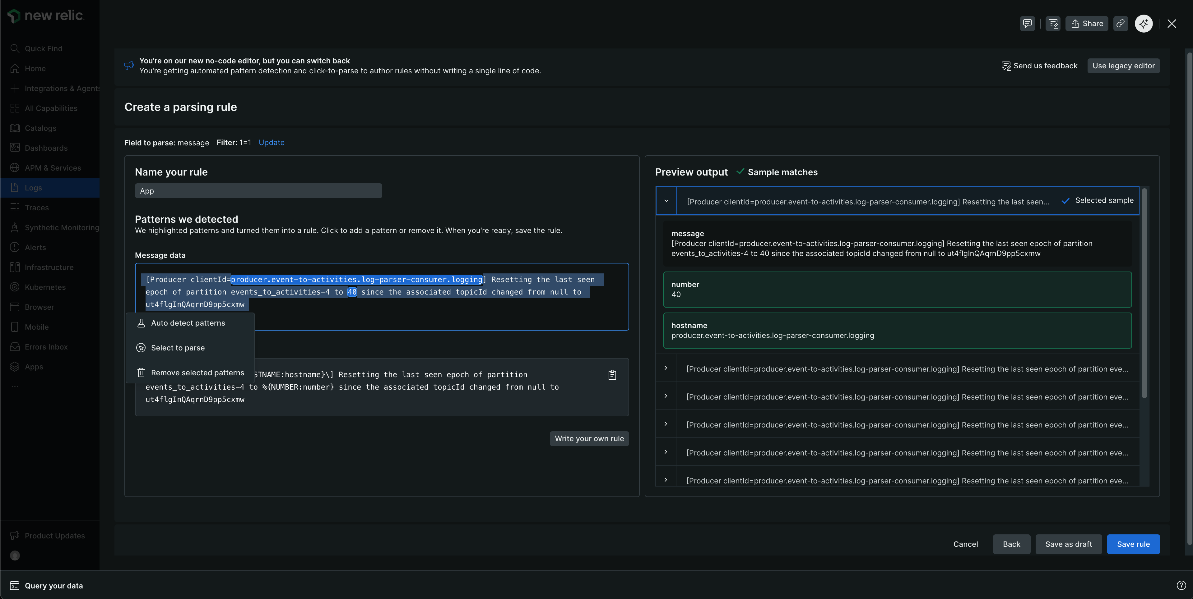 Utilisez No Code Log Parsing pour détecter et extraire des champs de vos échantillons de logs. New Relic analyse vos exemples de logs et suggère des modèles que vous pouvez configurer.