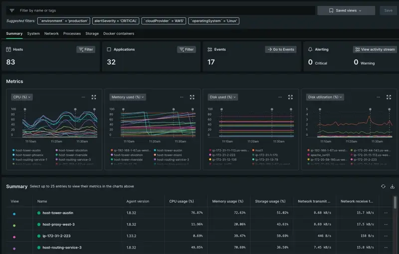 Avec notre agent infrastructure , vous pouvez collecter régulièrement des métriques et des données d'événements afin de savoir si votre infrastructure évolue de manière appropriée. Quels processus affectent l’utilisation du processeur et du disque ? Comment se comporte une application juste avant un pic de CPU ? Vos hôtes réagissent à une panne de base de données ? La rapidité avec laquelle vous pourrez répondre à ces questions fera la différence entre une panne totale, un incident mineur ou une mise à l’échelle automatique en douceur.