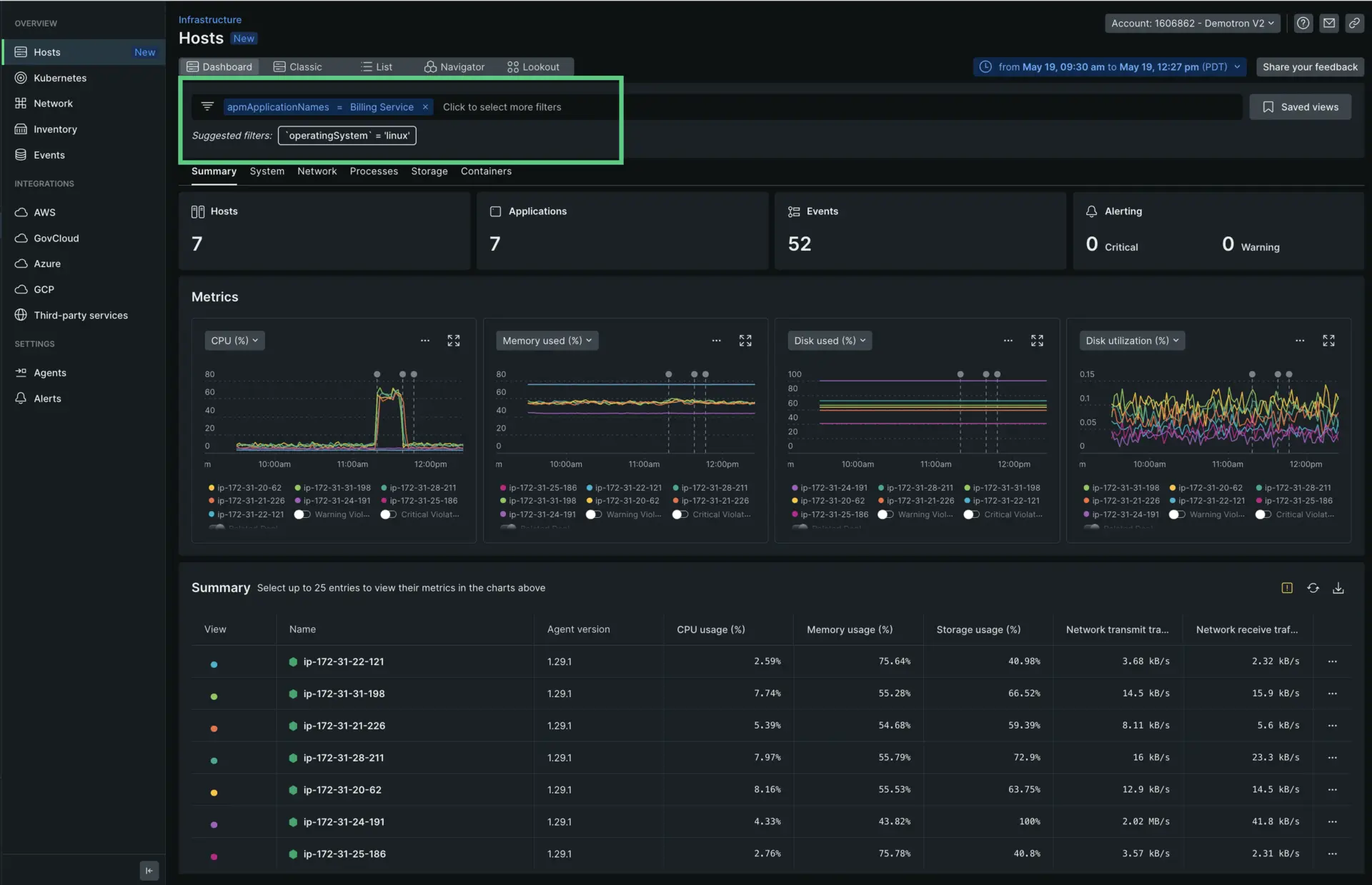 とInfrastructureのデータがリンクされると、検査する特定のアプリケーションを検索して、表示されるホストデータをフィルタリングできます。上記の場合、Billing Serviceをフィルタリングする必要があります。
