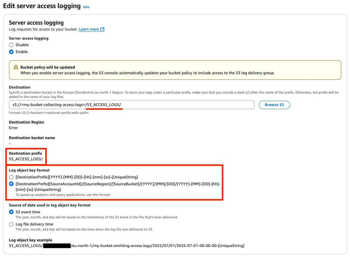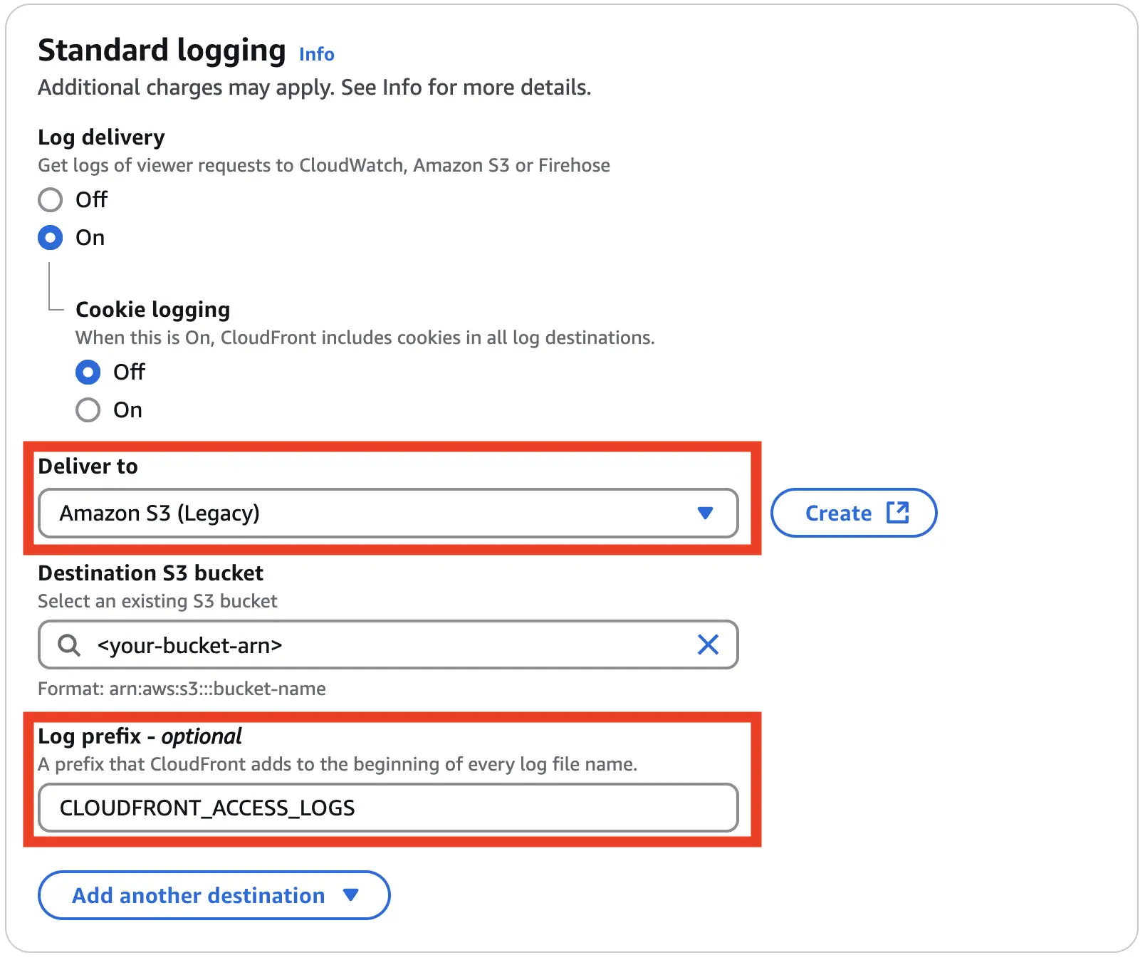 CloudFront 標準ログ出力先を設定するときは、「配信先」オプションでタイプ「Amazon S3 (レガシー)」を選択し、ログプレフィックスオプションを CLOUDFRONT_ACCESS_LOGSに設定します。