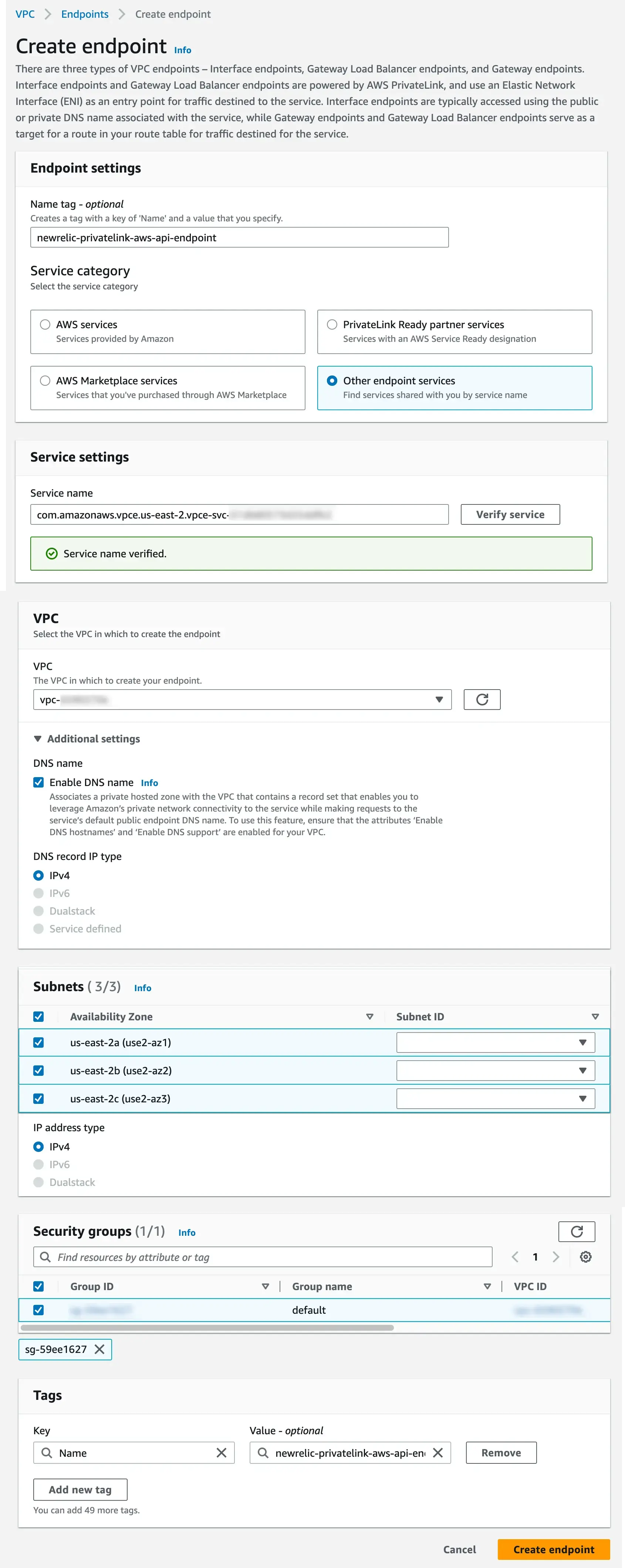 위 표에서 사용 중인 각 New Relic 엔드포인트 서비스에 대해 VPC 내에 VPC 엔드포인트를 생성하고 연결합니다 . 이러한 엔드포인트를 생성할 때 New Relic이 엔드포인트 서비스로 구성한 가용 영역에 해당하는 VPC 서브넷 및 보안 그룹을 구성해야 합니다.