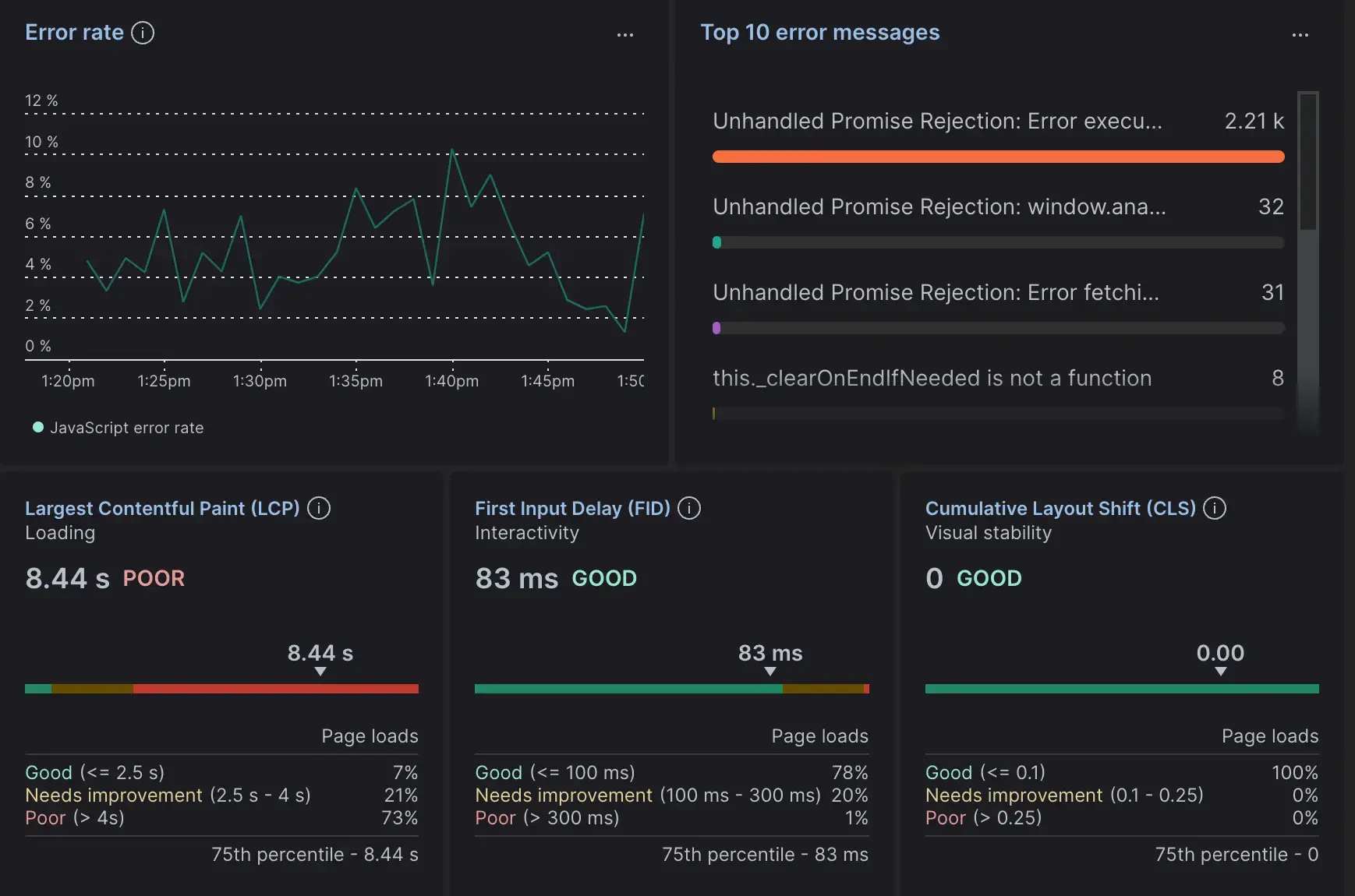 - Web vitals 페이지로 이동하려면 Largest Contentful Paint 링크를 클릭하세요. 이를 통해 페이지 URL, 장치 유형, 브라우저 유형 등에 따른 오류에 대한 보다 일반적인 개요를 제공합니다.