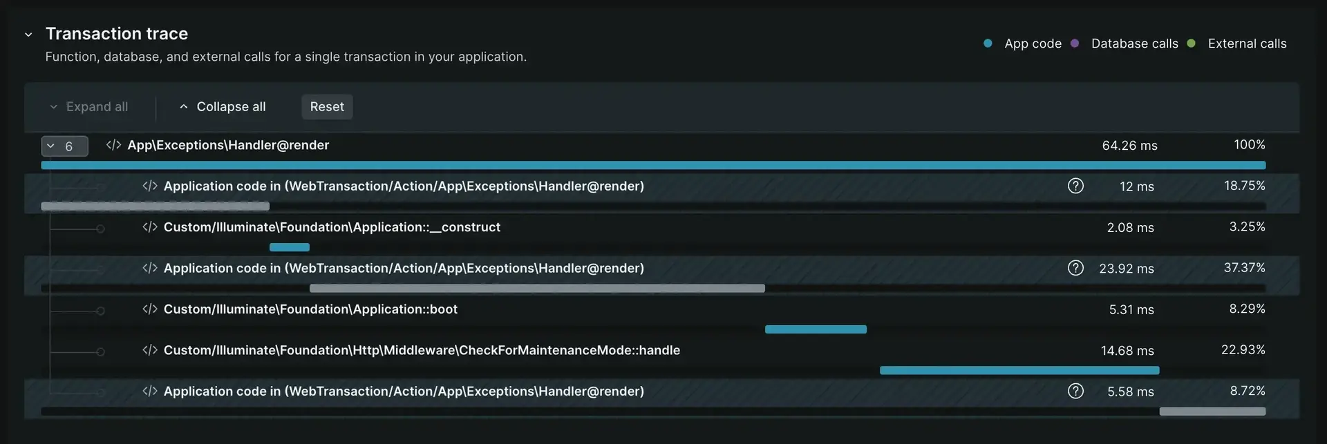 - Visualize suas transações: veja uma representação gráfica do cronograma da transação que mostra a duração de diferentes segmentos, como chamadas de banco de dados, chamadas externas ou execução de código.