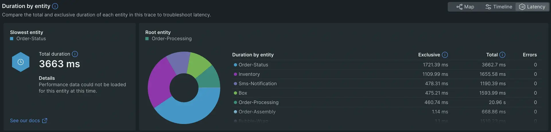 A seção Latência View fornece insights sobre os seis serviços ou componentes mais lentos que contribuem para a duração geral trace , juntamente com suas contribuições individuais e contagens de nós lentos.