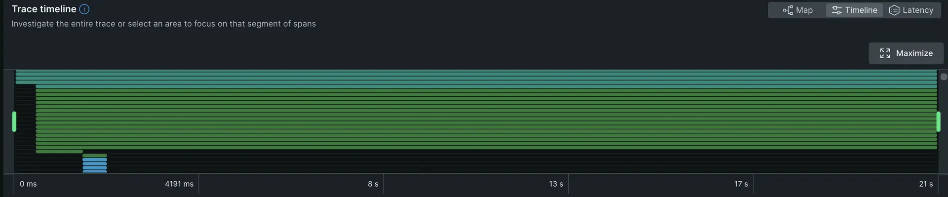 Passar o mouse sobre os nós nesta visualização exibirá o nome do segmento acima da linha do tempo. Clicar em um nó nesta visualização selecionará o mesmo nó na cascata e abrirá o painel de detalhes do segmento. Um arrasto horizontal nesta visualização filtrará os nós apresentados na cascata para aqueles que ocorrem na janela selecionada. Você pode alterar a janela filtrada movendo manualmente os controles verdes ou clicando no botão Reset timeline .